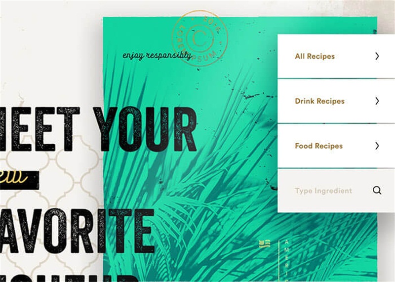 通过将美味的食物填满整个屏幕,利用手写草书字体,可以展现出更多的设计技术。