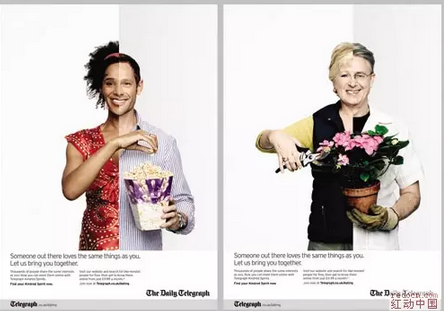 这两则广告同样是变异的对偶,表现出不同肤色,不同年龄,不同性别的人之间会有共同的喜爱,其中也包括《每日电讯报》。