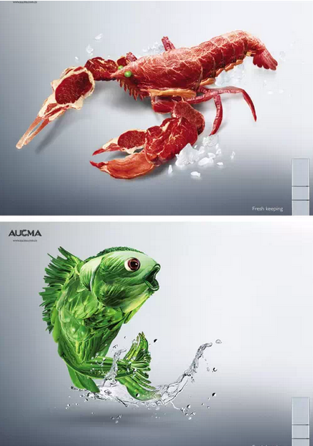 我们来看 AUCMA 冰箱系列广告。人们对龙虾、螃蟹、鲤鱼有着共同的认识,就是鲜。设计师把它们做得鲜活,鲜上加鲜。
